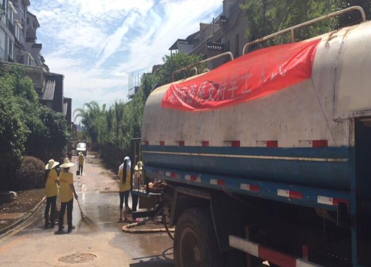 7月6日,烈日當(dāng)空,酷熱難耐,湘江長沙段剛退出警戒水位,一支由湖南路橋通泰公司長韶婁東延項(xiàng)目組成的支援災(zāi)后重建隊(duì)伍正在對含浦片區(qū)內(nèi)的汀湘十里、江山帝景等小區(qū)進(jìn)行地面沖洗、清淤、消毒等工作。