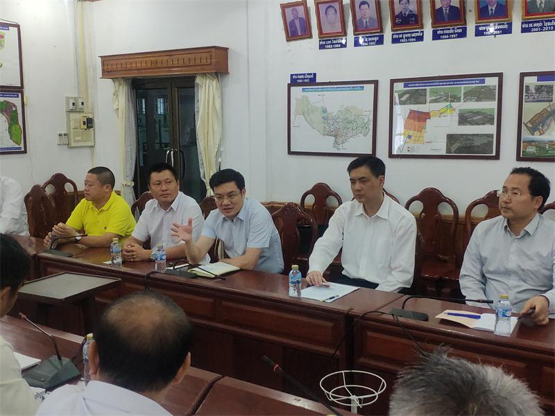 楊宏偉與中國駐老撾大使館經(jīng)濟商務(wù)參贊王其輝(右二)交流
